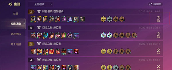 2、在生涯页面,点击对局记录,在对局信息后面可以看到回放按钮。