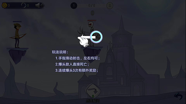 2、玩法说明如下:通过左右滑动屏幕,以手指操作实现拉弓射击;通过上下滑动屏幕来瞄准敌人,当松开屏幕时,即可发起攻击。若成功爆头敌人,敌人将直接死亡。
