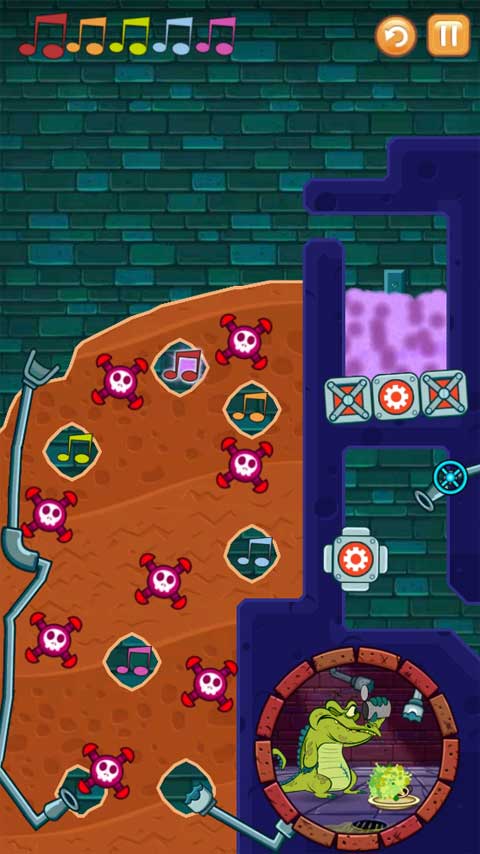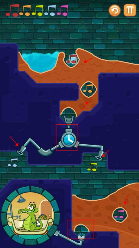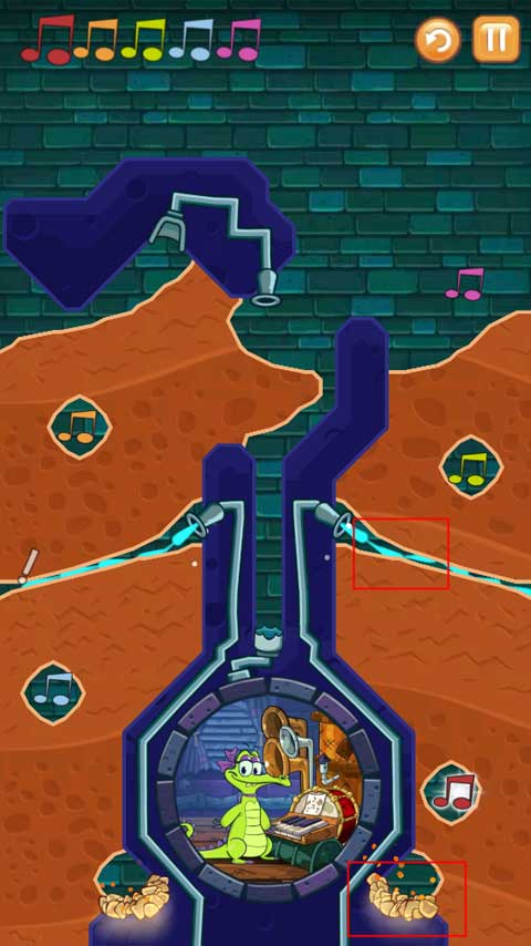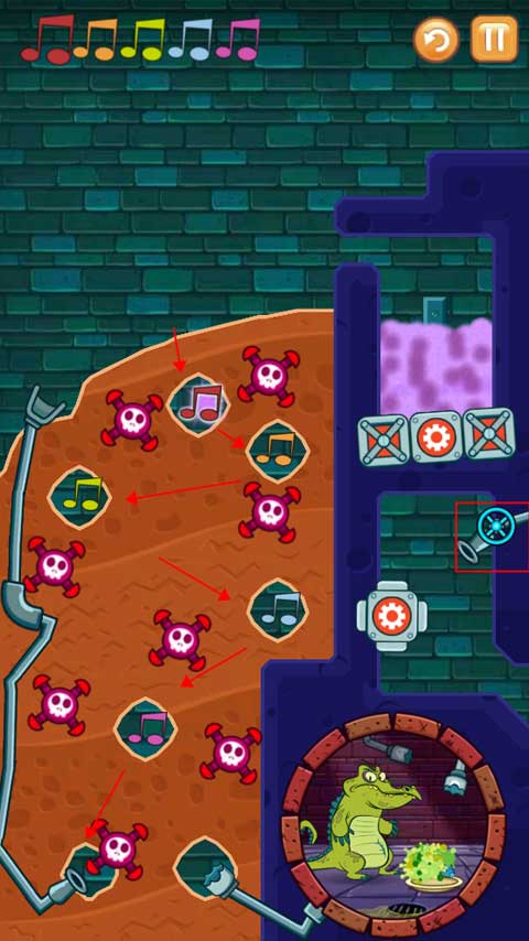 4、第二个关卡要求将受污染的水按照正确顺序导入所有音符,过程中需留意炸弹别爆炸,并且要确保小鳄鱼能有水洗澡。