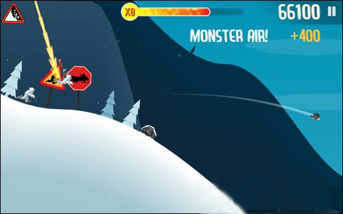 出现概率仅次于企鹅,刚骑上去时速度飞快,然而遭受一次冲击后,便会进入滑雪模式。在滑雪模式下,要是再碰到一只企鹅,就能把它带在身旁,它可为你抵挡一次冲击。不过,你最多只能带一只企鹅,再加上雪人,总共能为你抵消两次冲击。只是雪人行动较为迟缓,倘若你想借助它来翻跟头,往往会狠狠摔上一跤。