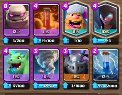 第一种卡组堪称经典,尽管成本较高,但其推进力极为恐怖,这一点毋庸置疑。圣水收集器不仅能推进节奏,还具备骗对方解牌的效果,而大闪更是能一举清除防御单位,在进攻方面堪称完美。不过,可能有人会觉得这套卡组的防守能力有所欠缺。针对这个问题,有两种解决办法。其一,可通过牺牲己方部分防御塔血量来换取优势;其二,大家在使用这套卡组时,思路不要过于僵化,卡组中的每个组件都兼具攻防属性。例如,圣水收集器完全可以当作牵引建筑来用。待取得费用优势后,再一举反攻对手。