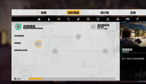 4、当我们升级后,会发现原本的,精准瞄准,已经亮起了绿色,这就说明我们已经升级成功了,并且我们解锁了相应的动作,