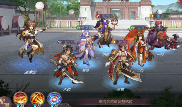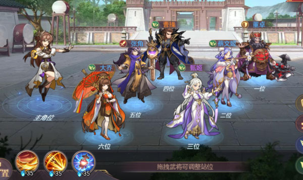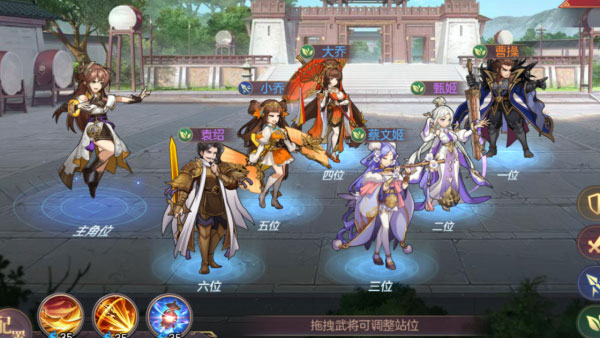 曹操1星可用,给辅助将回怒同时给对面减益。甄姬回血,女将光环。大乔给张角加buff。