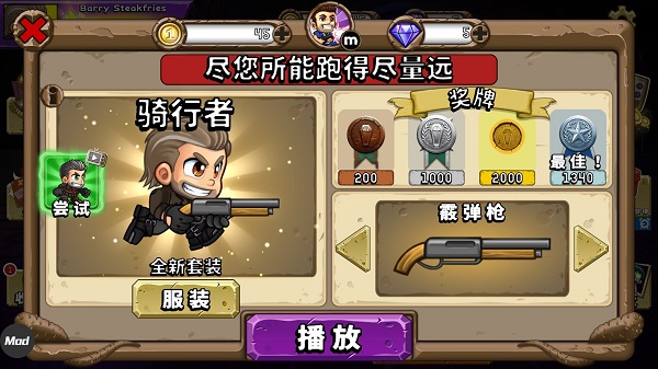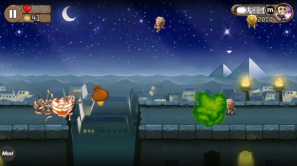 在这款游戏中,设置了四个风格各异的随机场景,范围涵盖从热闹繁华的都市,到充满神秘与荒凉的埃及木乃伊世界。游戏主角巴里的初始武器为猎枪,不过猎枪的攻击射程较为有限。在巴里前行的路径上,还能够找到诸如机枪、激光炮以及威力强大的武器箱包等各类装备。巴里的生命值显示在屏幕右上角,以三颗心作为标识,玩家可以通过拾取爱心道具来恢复血量。一旦巴里与敌人发生碰撞,就会损失健康值。当三颗心代表的生命值全部耗尽,或者巴里不慎跌落悬崖,游戏即宣告结束。