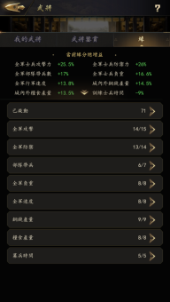 智略:影响出征部队的属性加成,属性较高数值的武将较适合担任“智囊”;影响奥义、术策的研究时长,释放术策成功率。