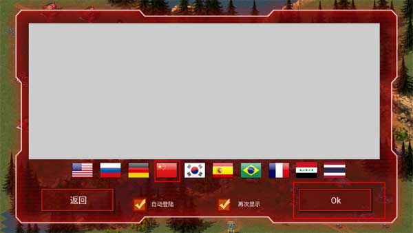 1、打开游戏之后,会显示很多国旗的国旗,选择好中文国旗之后点击Ok即可切换成中文模式。
