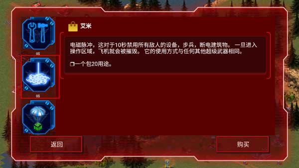 电磁脉冲,能在10秒内禁用所有敌人的设备、步兵装备,并使建筑物断电。一旦飞机进入其操作区域,就会被摧毁。它的使用方式和其他超级武器并无二致。