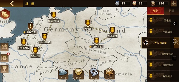 1、部署集团军部队,每个国家有其专属科技卡牌,通过科技卡牌加速征服世界的进程。