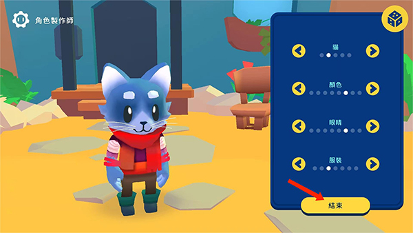 1. 开启Botworld Adventure汉化版,进入游戏之后,第一步先挑选角色,可供选择的有猫、狗、蜥蜴、水牛。选好角色后,接着对颜色、眼睛以及服装进行自定义设置。完成这些操作并确认无误后,点击【结束】选项。