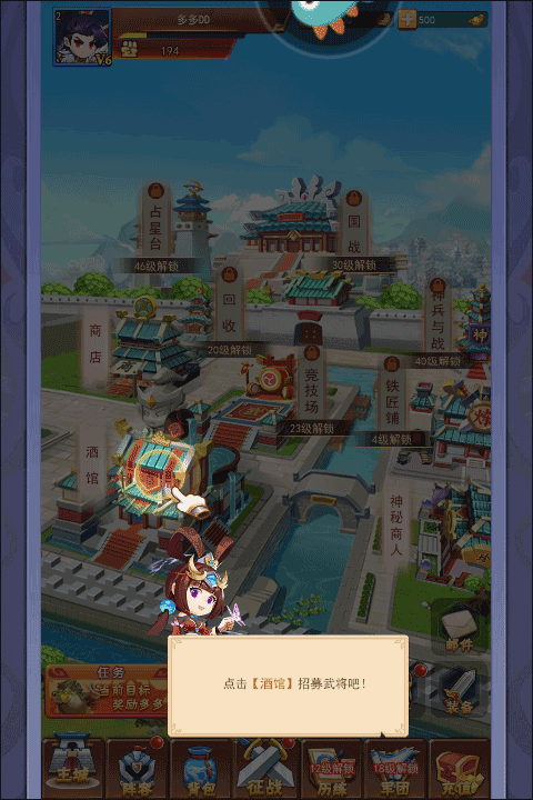 2、在这里选择并点击“酒馆”的选项,进入酒馆招募勇士;