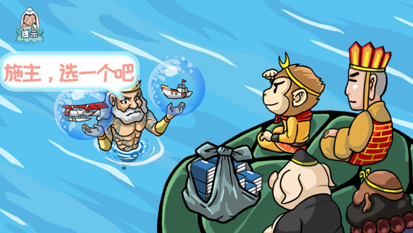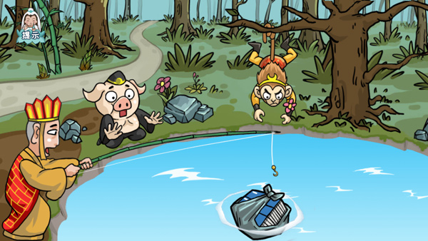 把鱼竿给唐僧,点击鱼钩开始钓经书