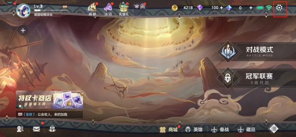 1、打开曙光英雄手游,点击右上角设置按钮;