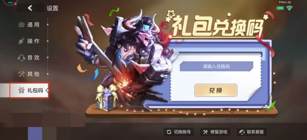 2、点击礼包码,在输入框输入,然后点击兑换即可。