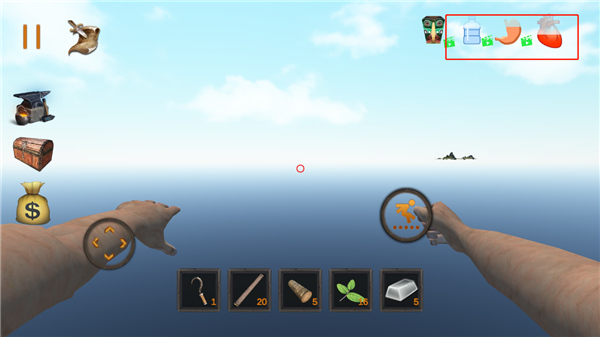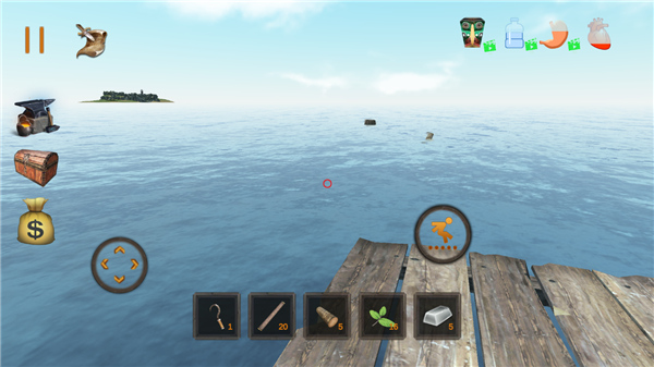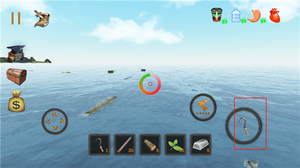 8、正式进入游戏后,玩家长按钩子,就能将其发射至海洋里,红色小圆圈所指示的便是发射位置。钩子发射出去后,玩家需看准时机,及时点击相同图标,收回绳子以获取勾到的物资,像木板、杂物、树叶、桶之类,这些物资经过加工,能为你的生存带来便利。