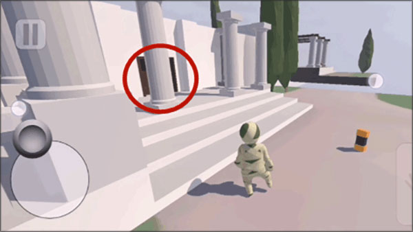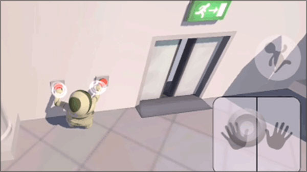 6、继续前行一段路程,同时按下大门旁的两个按钮,以打开大门。(需站在两个按钮中间,按住右下角操控两只手中间连线位置即可。)