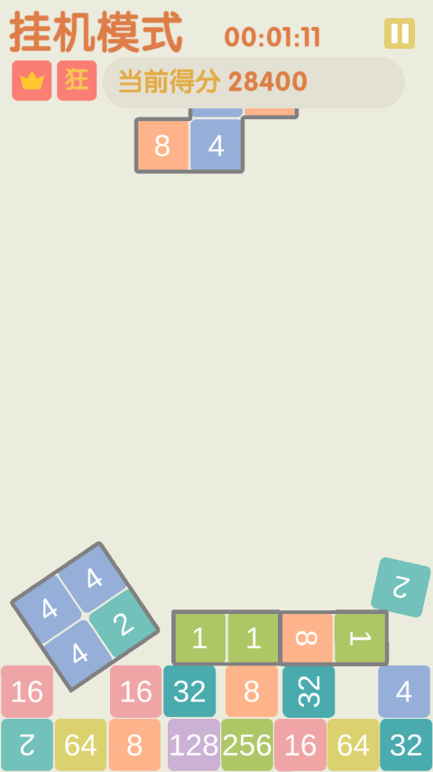 ③挂机模式:此模式或许堪称游戏里最有趣的一种。你会不由自主地紧盯着屏幕,十分钟乃至一小时都沉浸其中,就看着方块自行落下、合成、爆炸,分数不断攀升。并且,挂机模式即便退出后还能接着玩,仿佛永远不会终止。要是双击屏幕,方块便会直接砸下,设计得相当人性化。