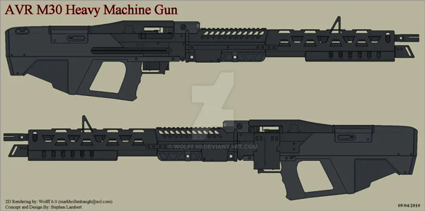 M60机枪:经改造后的M60机枪,配备了能让射手像使用步枪那样持枪的护手(由于潘多拉星重力较低,整枪重量会减至8.5公斤),采用圆形弹鼓,此外还有专门为阿凡达打造的AVR M30机枪。