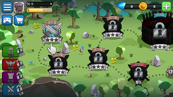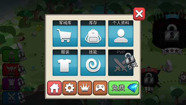 10、于菜单界面,诸如军械库、库存、个人资料、服装、技能以及PVP等功能选项皆可使用。以上便是小小角斗士中文版的游戏玩法。
