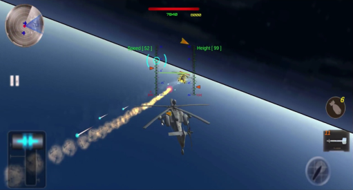 玩家在战斗中,驾驶直升机,操控握把,仿佛在天空自由翱翔。但要时刻留意敌人,攻击系统由玩家掌控,无论是射击还是发射导弹都任你操作。不过在进攻敌人时,防御也不能忘,敌人的火力不容小觑,灵活走位十分关键。