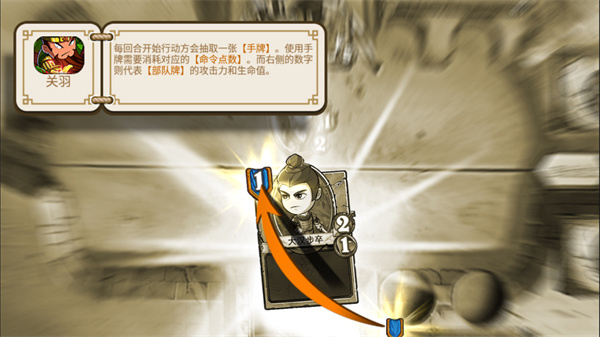 2、每个回合开始时,都会抽取一张手牌。使用手牌会消耗相应的命令点数,部队牌右侧的数字分别代表其攻击力和生命值。