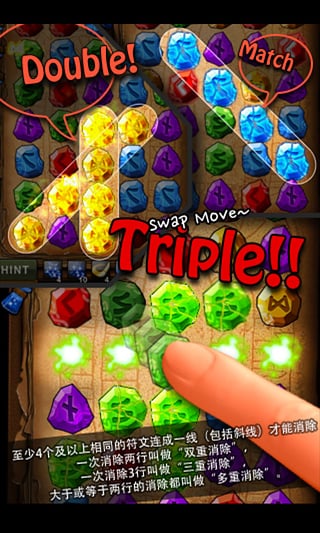与以往常见的“三消”游戏不同,RuneMaster Puzzle 采用的是四连消除规则。只需把同色的符文连成四个及以上,无论是横列、竖列还是斜列,届时就能听到极具听觉冲击力的“啪啪”符文破碎声啦,哈哈~