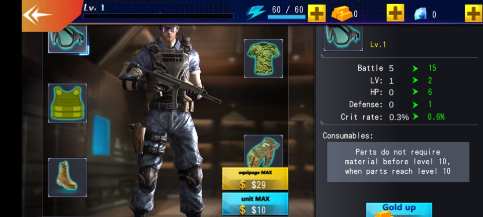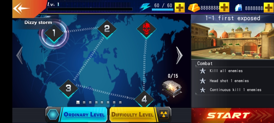 2、挑选关卡1,任务目标为消灭全部敌人,达成一次敌人爆头,实现一次敌人连击,点击【start】启动。