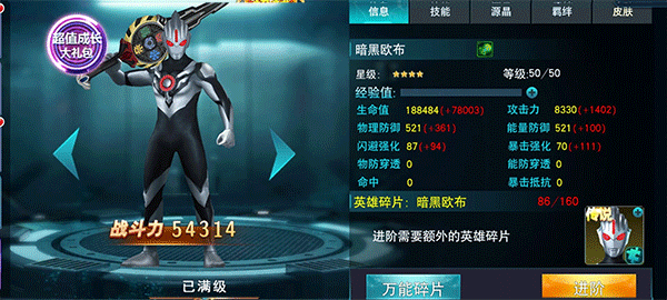 氪金角色还可以选择贝利亚,和赛罗一样,贝利亚前期并不强,但是如果给他买一个极恶贝利亚的皮肤,那就会变强,不过这个皮肤不好获得,有条件的可以通过皮肤碎片月卡获得。(微氪玩家不建议选择贝利亚)