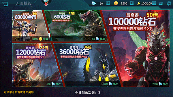 无限挑战钻石挑战场共设有四个档次:其一,花费50钻石可挑战一次,最高能获取12倍钻石奖励,外加赛罗无限形态皮肤碎片*1;其二,消耗500钻石挑战一次,最高可得到24倍钻石奖励,以及赛罗无限形态皮肤碎片*2;其三,用1000钻石进行一次挑战,最高可收获36倍钻石奖励,同时获得赛罗无限形态皮肤碎片*3;其四,投入2000钻石挑战一次,最高能拿到50倍钻石奖励,还可得到赛罗无限形态皮肤碎片*5 。