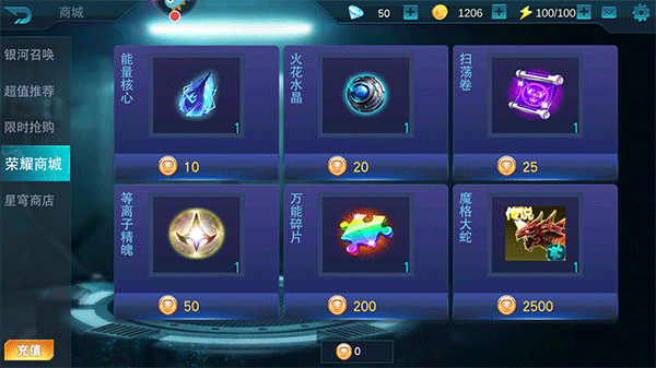 在荣耀商城里,购买任何物品都需消耗荣誉币。荣誉币能够通过竞技场等途径获取。荣耀商城所售物品极为丰富,主要有能量核心、火花水晶、扫荡券、等离子精魄、万能碎片、魔格大蛇,性价比相当高!