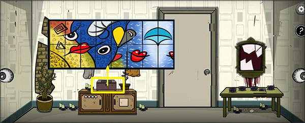 7、注意窗户场景中墙上挂的图画右下角的图案,用刚得到的钥匙打开场景中桌子下方的抽屉,得到【把手】。