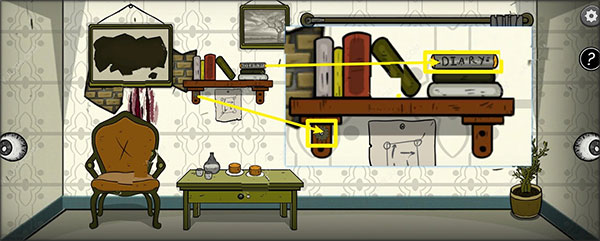 6、点击右侧眼睛向右移动一次来到窗户场景,在中间书架上拿到【日记本】和【齿轮1】。