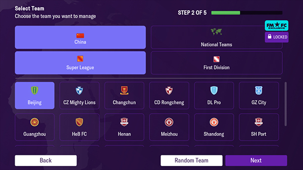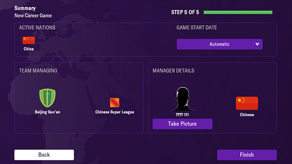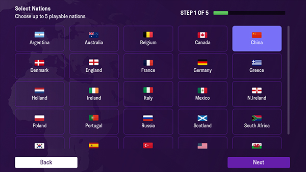 2、游戏创建阶段共分为五步,首先第一步需要先选择国家和对应地区的联赛,这里以选择中国举例说明