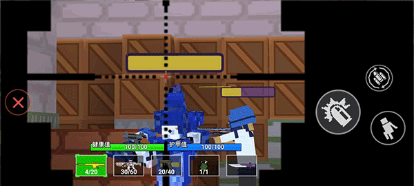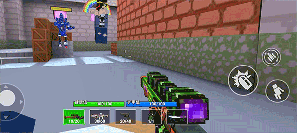 5、通过左手滑动屏幕来操控游戏角色移动,右手滑动屏幕则用于控制准心移动。点击单个子弹图标即可发动攻击,小人图标是用来控制角色跳跃的,而多个子弹图标可用于安装子弹。