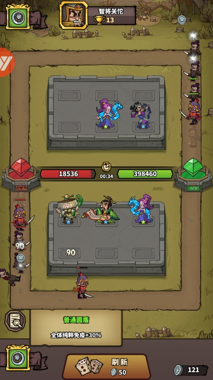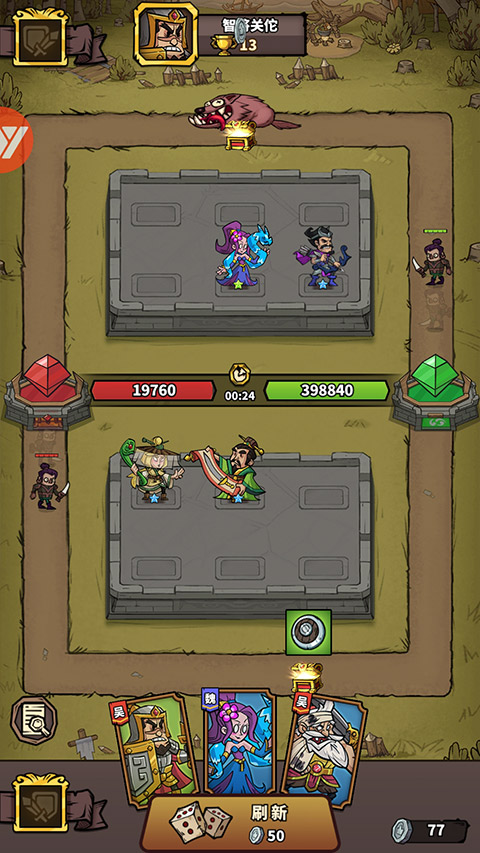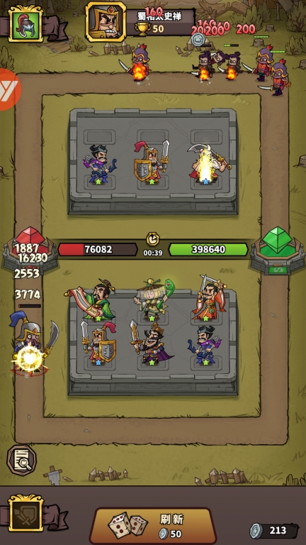 真人竞技,3秒急速匹配!玩家可选派10名武将出战,战中可以根据对手阵容调整应对策略,战中获得银币还可合成神级武将!