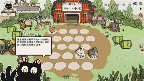4、进入游戏如图,玩家需跟随引导操作,通过点击新的一天从养殖的动物获取金币,然后在规定天数到达后给猫神上供。