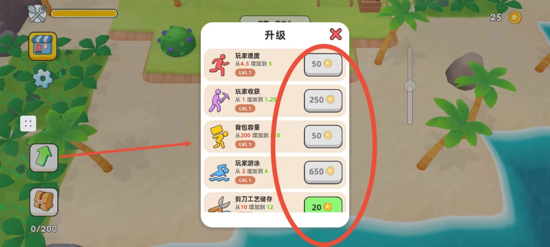 3、通过左侧功能箭头进入角色强化菜单,可消耗资源提升移动速度、采集效率及背包存储上限等属性。
