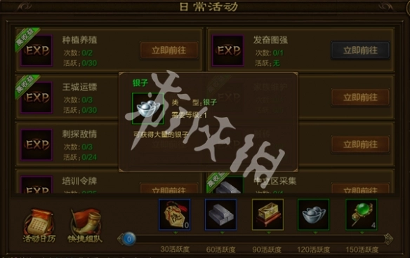 2、活跃度奖励:“活动栏目”主要包含日常任务、精彩活动以及即将开启的活动。每个栏目设有相应任务,完成任务即可获得一定活跃度。当活跃度积累到特定数量,就能获取银子,同时还有经验相伴,二者皆备。